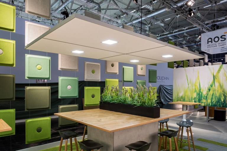 Akustikelemente, Stellwände, Wandabsorber optional mit Digitaldruck,Wechselbezug, Deckenabsorber ohne und mit LED-Beleuchtung fest unter der Decke oder abgehängt, hochschallabsorbierend, in verschiedenen Abmessungen und Formen, Oberflächen, Bezüge gem. Herstellerkollektion