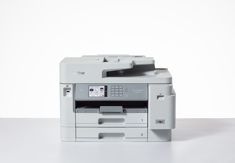 A4-MFP Farbe, Tinte, 4in1, 50-Blatt-Duplex-ADF, 2x250-Blatt-Kassette und 100-Blatt-Universalmagazin, bis 30 Seiten / Minute, A3-Druckfunktion, 8.8 cm Touchscreen, Starttinte für ca. 2.250 SW- / 975 Farbseiten, USB / LAN / WLAN, 3 Jahre vor-Ort-Garantie und 15.000-Seiten-PrintAirbag